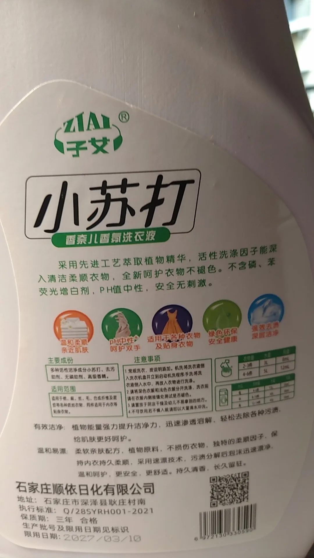 小苏打洗衣液不错,用着放心,成分安全,小孩衣物也可以一起清洗,香味不浓不淡刚刚好,很好闻,味道很香,洗的衣服特别干净,用完回购
