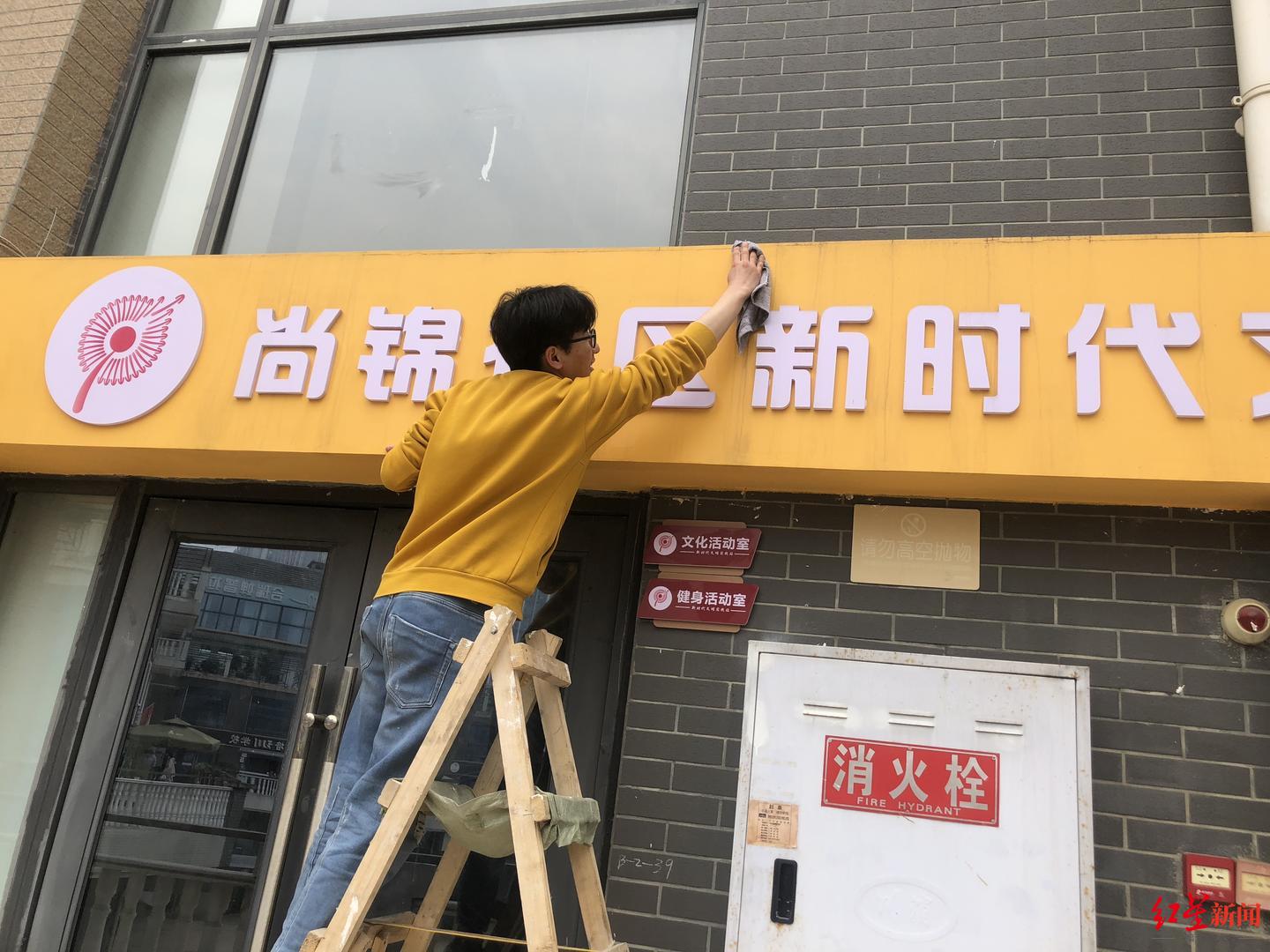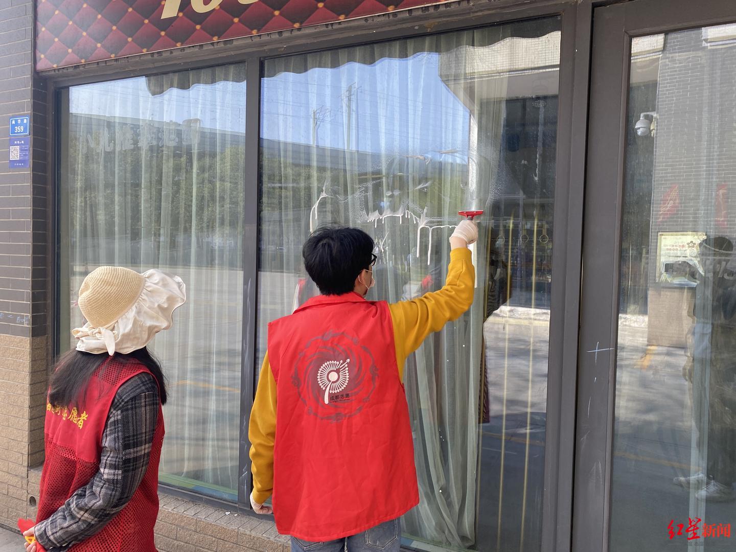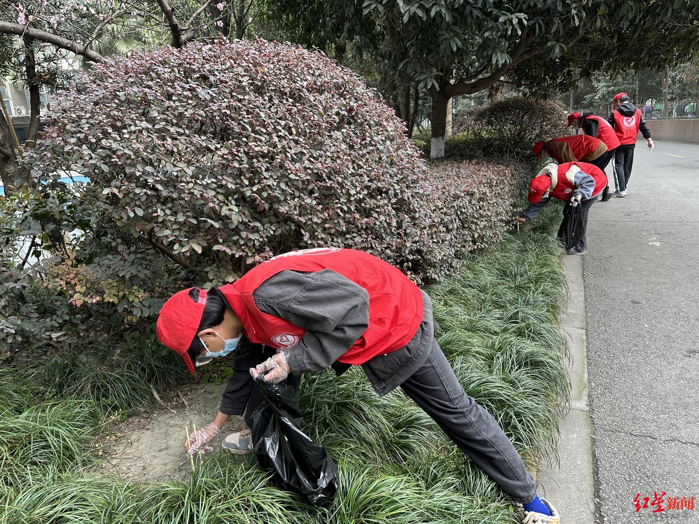 11日上午,红星新闻记者在西园街道尚锦社区缤纷年华小区外看到,6名志愿者拿着扫帚、夹子、抹布等工具捡拾绿地垃圾、擦拭公共器械、清理“牛皮癣”。