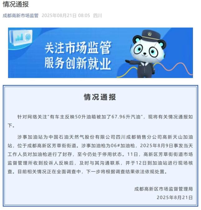 涉事加油站为中国石油天然气股份有限公司四川成都销售分公司高新天山加油站,位于成都高新区芳草街街道。涉事加油枪为06#加油枪,2025年8月9日事发当天工作人员对加油枪进行了封存,至今仍处于停用状态。11日,高新区芳草街街道市场监督管理所收到投诉人反映后,及时与其沟通联系,并于12日到加油站进行现场核查。目前相关情况正在全面调查中,下一步将根据调查结果依法依规处置。