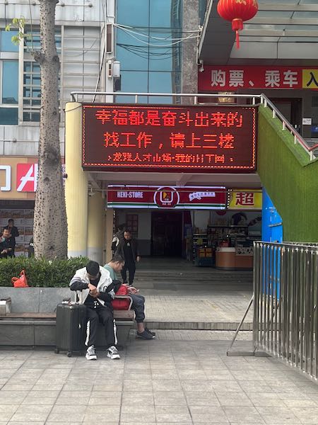 记者离开时已是下午五点,但太阳还未完全落山。广场中央的一个电子屏如来时一样滚动着这样两行文字:“幸福都是奋斗来的。找工作,请上三楼”。从广场旁的过街天桥上朝下望去,余晖透过树的缝隙洒在广场和通往人才市场和龙华汽车站的阶梯式台阶上,也洒在人们的身上。