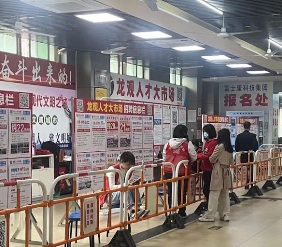 与广场上的熙熙攘攘不同的是,三楼的人才市场人流较少,偶尔能看到有人前来咨询。楼下职介公司的工作人员表示,传统招聘渠道早已悄然生变,近两年人才市场的展位一直在变少,基本是是带人入工厂,做劳务派遣。
