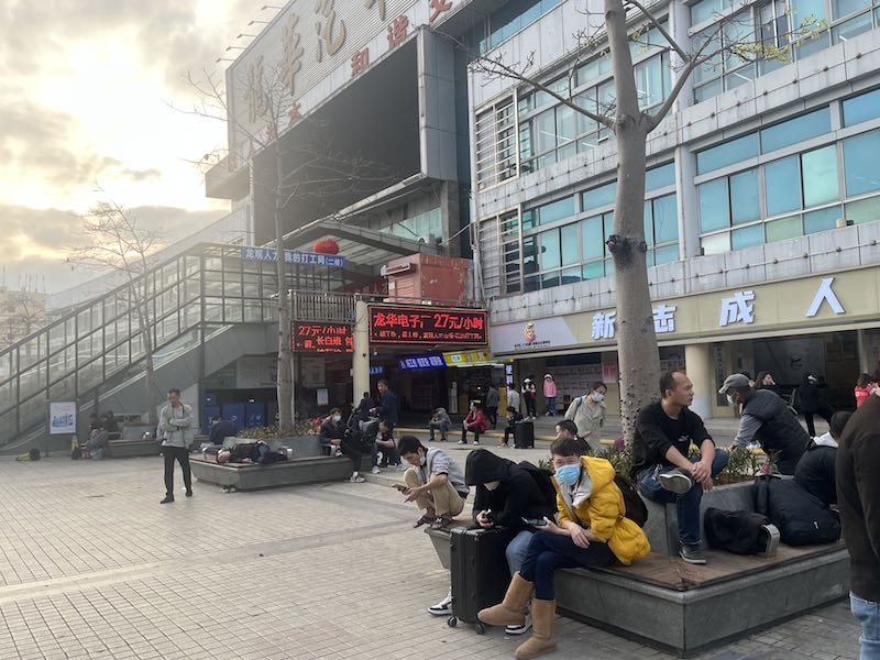 龙观人才大市场是深圳极具规模的劳务工求职市场。2月7日下午,记者在龙观人才大市场看到,龙华汽车站广场上人头攒动,劳务工们三三两两地聚集在一起。大致估算,同一时间内广场上有二、三百人。操着各地口音、年龄各不相同的求职者们拖着行李箱、背着双肩包在广场短暂逗留,落脚休息。
