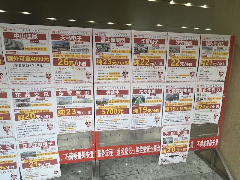 与前来求职的人相对应的,是工厂招工需求也较为旺盛。广场上,最醒目的当属龙华汽车站大楼一楼的门脸,华辉人力、安联人力、新亚泰人力等多家职介公司一个挨一个的把门店开在这里,店面门前均放置着花花绿绿、贴满招聘启事的牌子,包括富士康、OPPO、立讯精密、蓝思科技等知名企业。招聘岗位多为电子厂、物流仓储等制造业、物流工厂的普工、操作工,有小时工也有正式工。